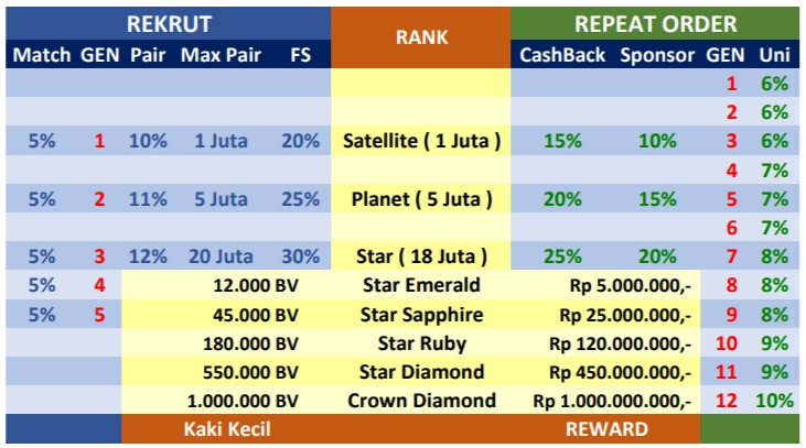 Di bawah ini adalah tabel bonus KIS Plan. Yang terdiri dari 2 tabel, yaitu: tabel bonus dari rekrut dan tabel bonus dari repeat order